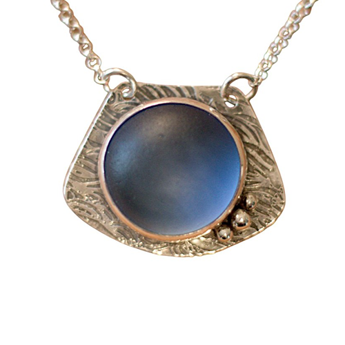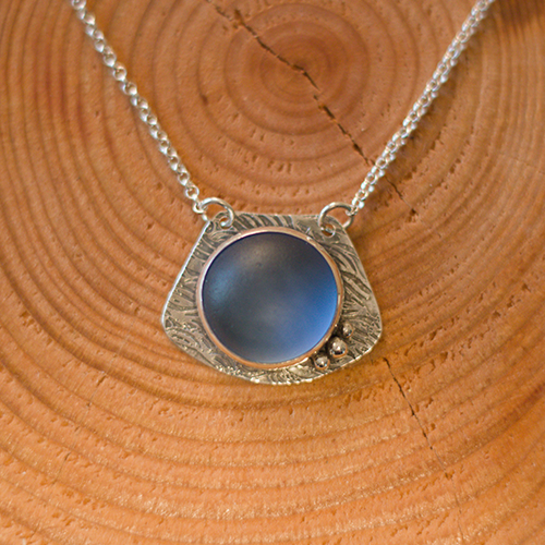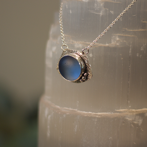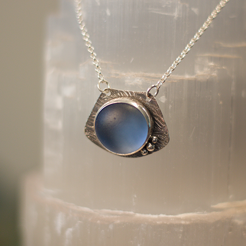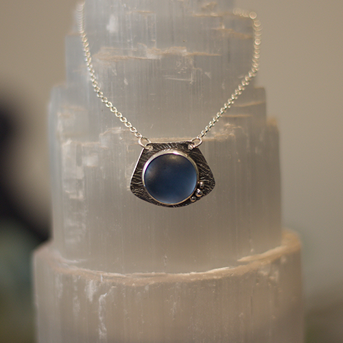 A piece of smoky cobalt seaglass set in sterling silver. The backplate is etched with a wave pattern and is on a 17 inch rolo chain.